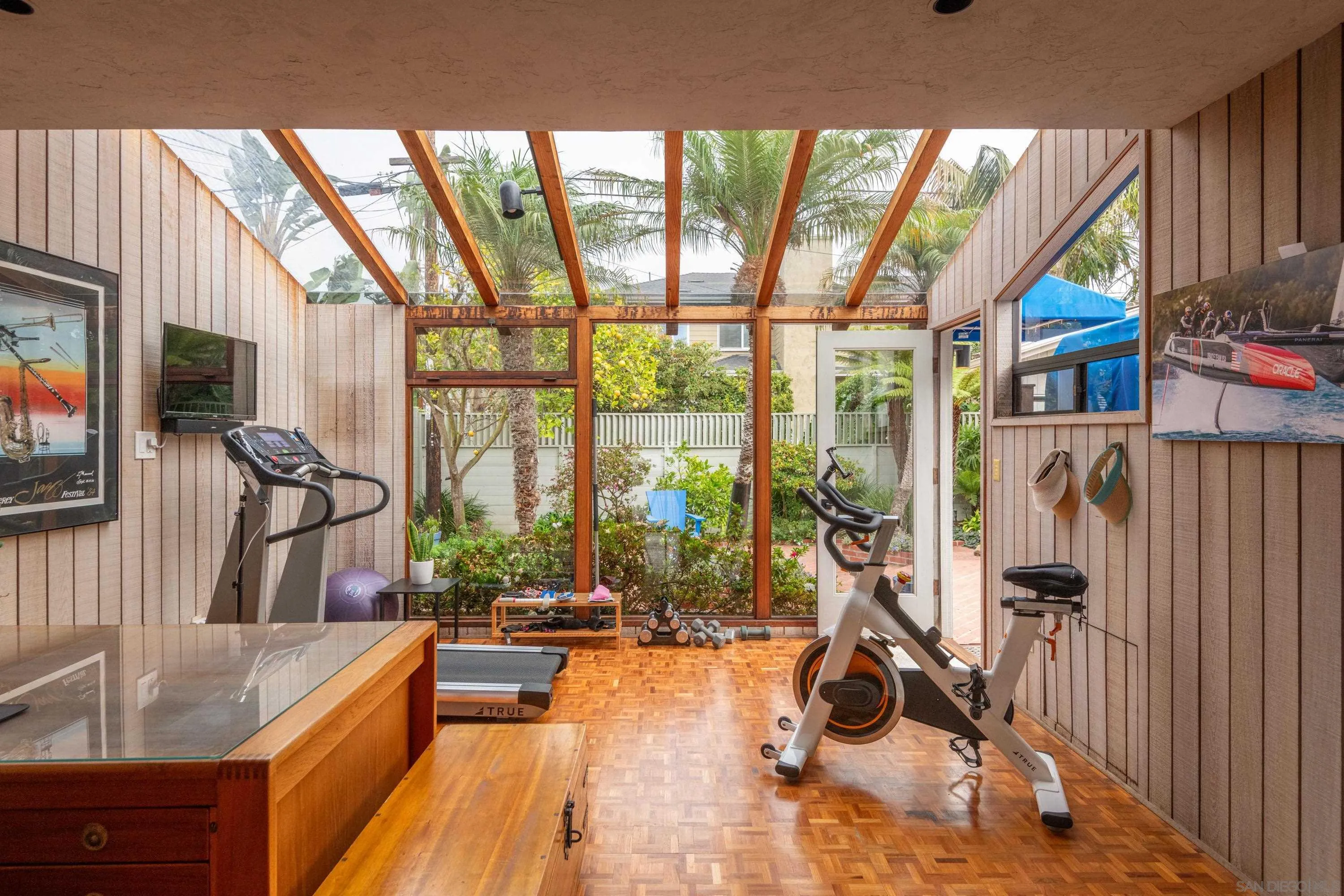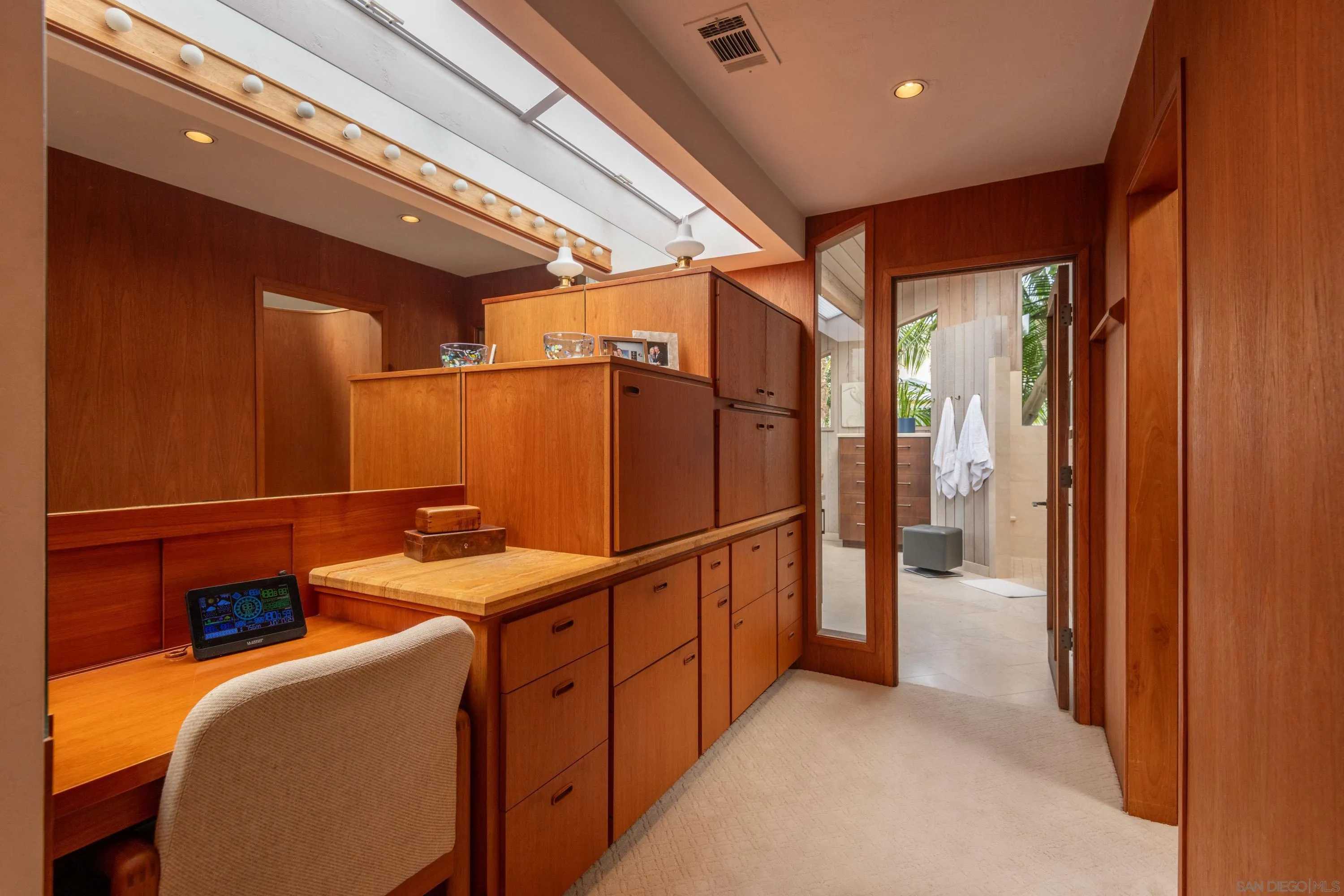 Designed to evoke nostalgia for the open sea, this single level mid-century home is an architectural dream with beautiful wood and tile floors, polished teak finishes, and unmatched craftsmanship. The over-sized primary bedroom includes a sitting area with fireplace, sleek rounded walls, and copious cabinetry. Strategically placed skylights are a highlight of the luxurious light-infused bathroom which features a doorless shower with bench, dual sinks, and heated floors while natural wood materials, multiple windows, and garden views combine to create a spa-like setting. There is a guest bedroom and full bathroom plus a separate sunroom which serves as the perfect flex room - use as an office, gym, or meditation room. The garage has been customized to include a refrigerated 600+ bottle wine room, an extensive work bench, laundry station with sink, and additional storage, while still retaining plenty of room to accommodate parking for one car. Brick patios and wood decks offer multiple sitting areas to enjoy the peaceful outdoors in this quiet, convenient location near Pt. Loma Nazarene and just minutes to the heart of downtown.